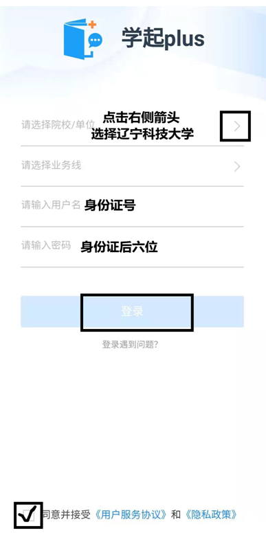 2、進(jìn)入app后,選擇遼寧科技大學(xué),輸入用戶(hù)名、密碼,并同意政策