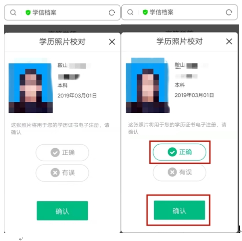 6、如無誤,請?jiān)趯W(xué)歷照片處點(diǎn)擊確認(rèn),然后告知自己的班主任,已完成圖像校對。如有誤,請第一時間聯(lián)系自己的班主任。